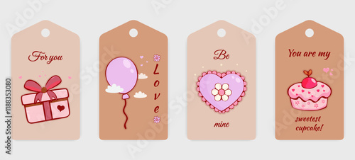 Set of four Valentine's Day gift tags featuring romantic designs, including a gift box, balloon, heart, and cupcake with loving messages. Vector art for packaging, print designs.