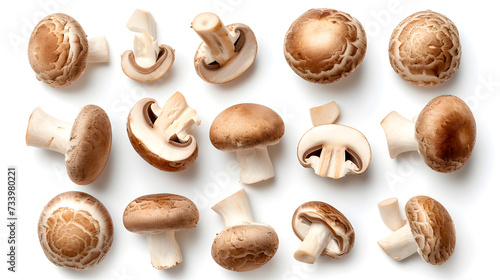 Set of fresh whole and sliced champignon mushrooms isolated on white background. Top view