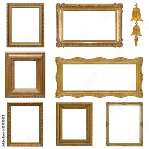 Set of golden frames for paintings, mirrors or photo isolated on white background
