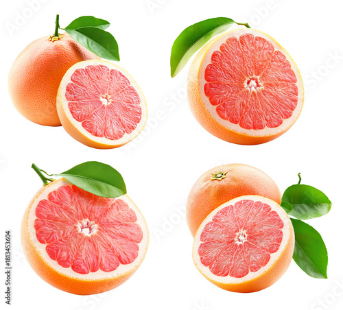 Set of grapefruit with green leaves isolated on white transparent background. Concept of healthy citrus fruit