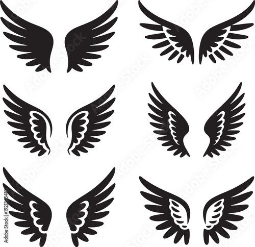 Set of hand drawn bird or angel wings of different shape in open position. Black doodle wings set