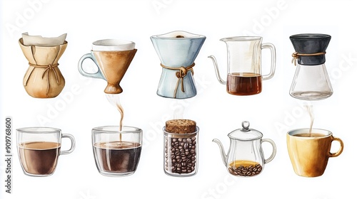 set of hand drawn illustrations, coffee equipment , moka pot, mug, dripper, cafe, set of cups of coffee