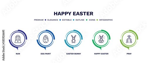 set of happy easter thin line icons. happy easter outline icons with infographic template. linear icons such as nun, egg paint, easter bunny, happy pray vector.
