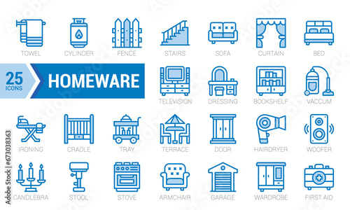 Set Of Homeware. Outline Colour Blue Icons Pack. Vector Illustration.