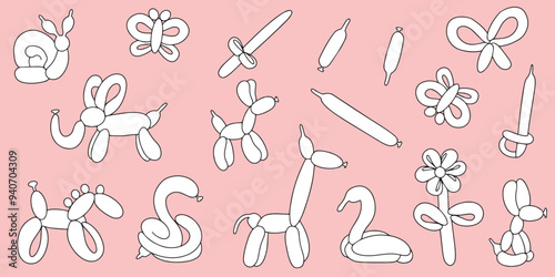 Set of inflatable toys from twisted balloons in doodle style. Design element for greeting card, invitation card, print, flyer, banner.