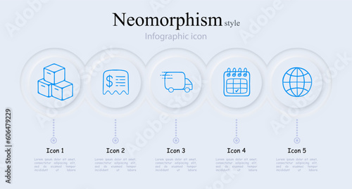Set of international delivery icons. Parcel, package, globe, transportation, shipping. Logistics cocnept. Neomorphism style. Vector line icon for Business