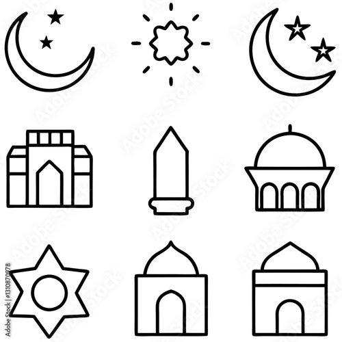 set of Islamic religious symbols Linear icon collection vector art illustrations. Eid Mubarak