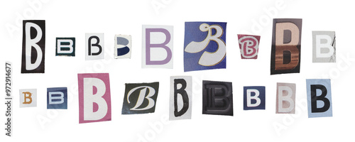 Set of isolated cut-out letter “B” from magazines on a transparent background, retro y2k style