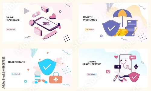 Set of landing page templates for online healthcare, health insurance, online health service, online medical consultation. Doctor and therapist for website, UI, mobile application, posters, banners.