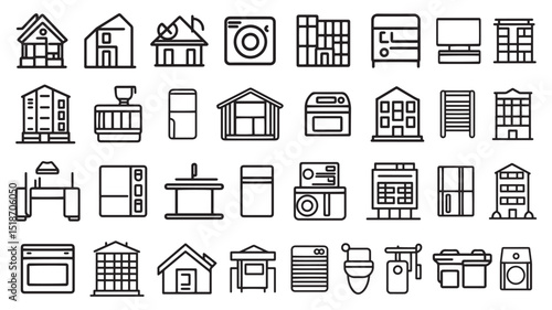 Set of line icons related to apartment, flat, home, architecture, property, building, residential, Editable stroke. Vector illustration