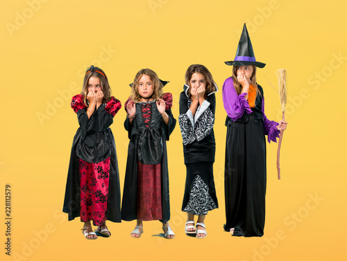 Set of Little girl dressed as a vampire for halloween holidays is a little bit nervous and scared on orange background