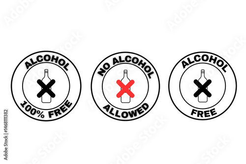 Set of No Alcohol allowed, alcohol free, 100% alcohol free stamp, logo, icon, tag, label, design for advertising, marketing and promotion