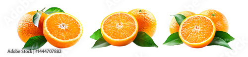 Set of orange, juicy orange half, and vibrant green leaf isolated on white transparent background. Concept of tropical fruits and citrus freshness