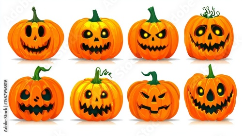 Set of orange pumpkins with different faces, on a white background, in a vector illustration style,
