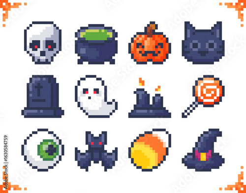 Set of pixel art icons on Halloween theme. Skull, cauldron, pumpkin, cat, tombstone, ghost, candles, lollipop, eye, bat, candy corn, witch hat. 16x16 pixels