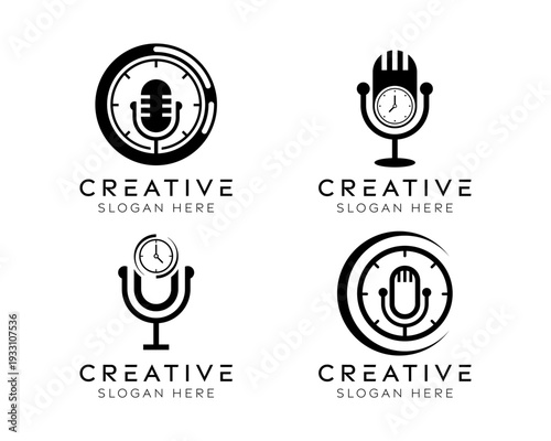 Set of podcast clock logo design templates. Modern isolated mic and clock design for broadcasting, management, and technology.