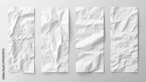 Set of realistic vector illustrations of crumpled and wrinkled white paper mockups Includes creased blank vertical sheets and empty folded cardboard banners with a rumpled surface