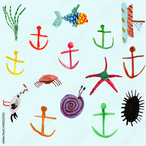 Set of sea animals, seaweed, ship and anchor. Watercolor