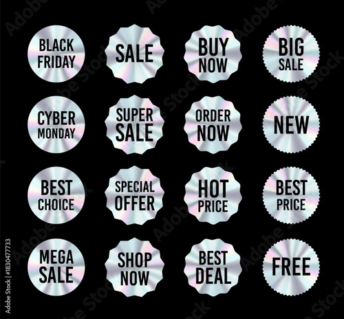 Set of shiny holographic round and star-shaped sale stickers with black text for Black Friday, Cyber Monday, and seasonal promotions. Vector design perfect for retail advertising, online stores, and