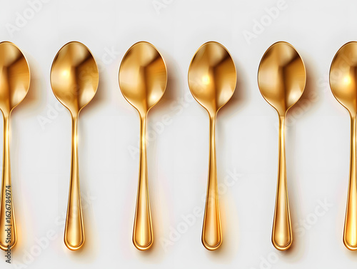 Set of six golden dessert spoons arranged on a white surface