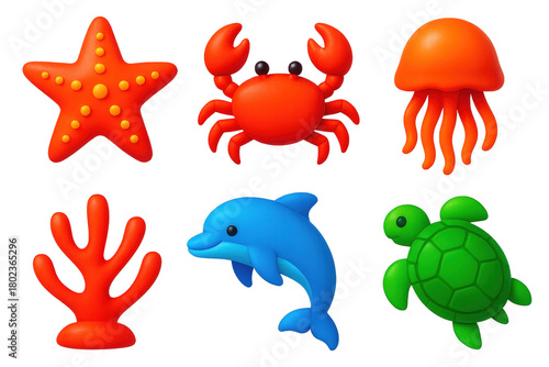 Set of six sea creatures, including a starfish, a crab, a jellyfish, a dolphin