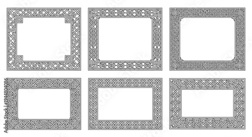 Set of six traditional Asian rectangular frames, each featuring unique geometric patterns and elegant borders, presented on an isolated white background.