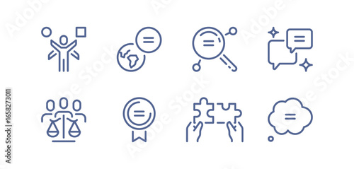 Set of social equality and justice icons, inclusive rights, equal access, fair treatment, diversity, participation, human rights, opportunities, community support, group collaboration vector symbols.
