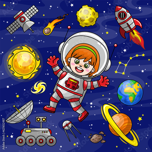 Set of space elements. Vector illustrations in cartoon style. Cute astronaut girl, spaceship, planets Earth and Saturn, moon, star Sun, spiral galaxy, comet, satellite, lunar rover and other. Universe