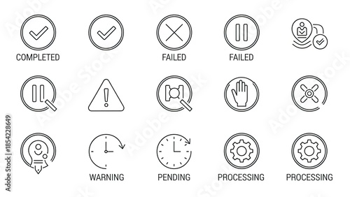 Set of status icons: completed, failed, pause, warning, pending, processing, and more
