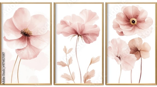 Set of three Abstract Pink Flower Posters in Gold Frames on white background.