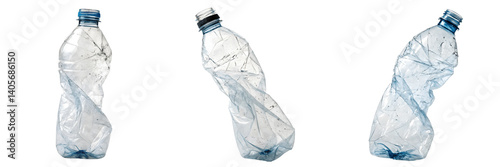 Set of Three Crushed Plastic Bottles Depicted Isolated On Transparent Background