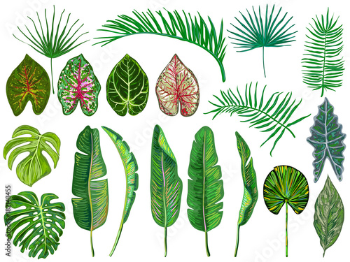 Set of tropical leaves. Jungle vector illustration. Vintage big collection of hand drawn botanical design elements isolated on white. Summer tropical design. Green palm leaves. Beautiful fashion art