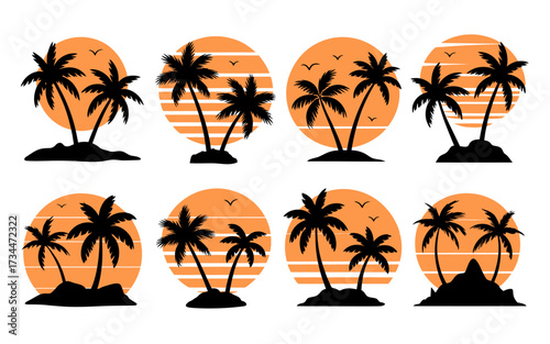Set of tropical sunset illustrations with palm trees and birds silhouettes