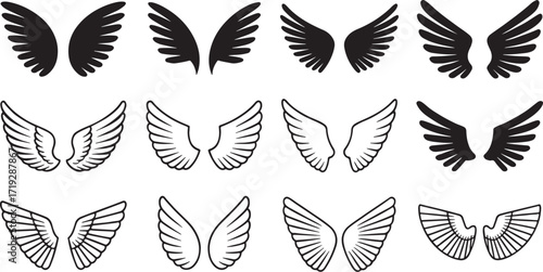 Set of twelve artistic wing illustrations in black and outline styles, ideal for tattoos, logos, and graphic design.