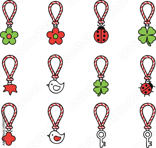 Set of twelve cute cartoon charms and keychains with flower, ladybug, bird, and clover motifs