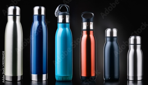 Set of various modern vacuum water bottles on black background