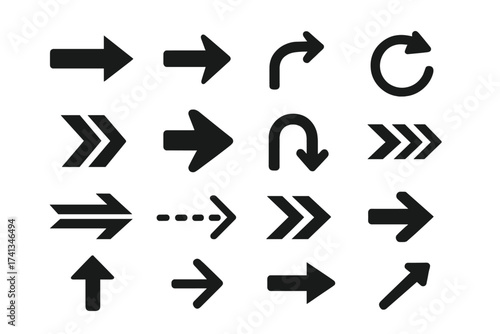 Set of vector arrows. Black arrow icon collection on white background. Direction and navigation signs. Pointer, next, back, up, down, reload, and refresh symbols.