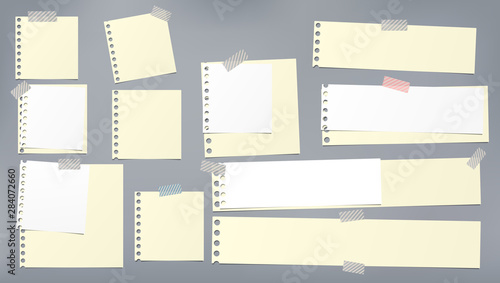 Set of white and yellow note, notebook paper pieces stuck with sticky tape on dark grey background. Vector illustration