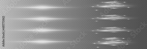 Set of white horizontal highlights. Laser light beams, horizontal light beams. Beautiful light flashes. On a transparent background.