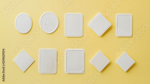 Set of white name badges in different shapes, isolated on a pastel yellow background
