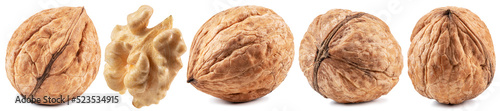 Set of whole walnuts, walnut kernel and isolated on white background.