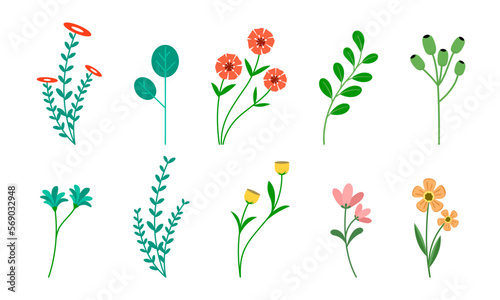 Set of wildflowers. Collection of flower gardens. Medicinal plants with colorful flowers. Flowers are isolated on a white background. Vector illustration