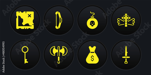 Set Old key, Christian cross, Medieval poleaxe, money bag, Bomb ready to explode, bow, Dagger and Pirate treasure map icon. Vector