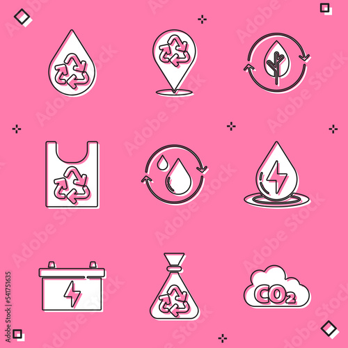 Set Recycle clean aqua, and leaf, Plastic bag with recycle, Water energy, Car battery and Garbage icon. Vector