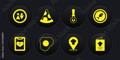 Set Restaurant cafe menu, Served fish on plate, Scrambled eggs, Chef hat with location, Pizza knife, Slice of pizza, Cookbook and Toilet icon. Vector
