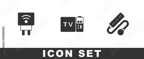 Set Smart electric plug, Multimedia and TV box receiver and Electric extension cord icon. Vector