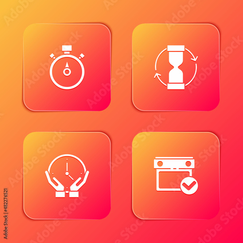 Set Stopwatch, Old hourglass, Clock and Calendar with check mark icon. Vector