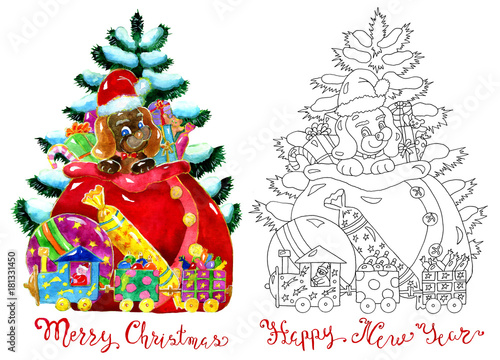 Set with funny puppy in Santa bag. Hand drawn illustration for poster, greeting card, invitation