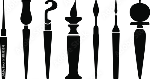 Seven black silhouette illustrations of various stylized tools on a white background display art