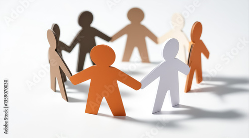 seven diverse paper figures holding hands in a circle symbolizing unity and togetherness